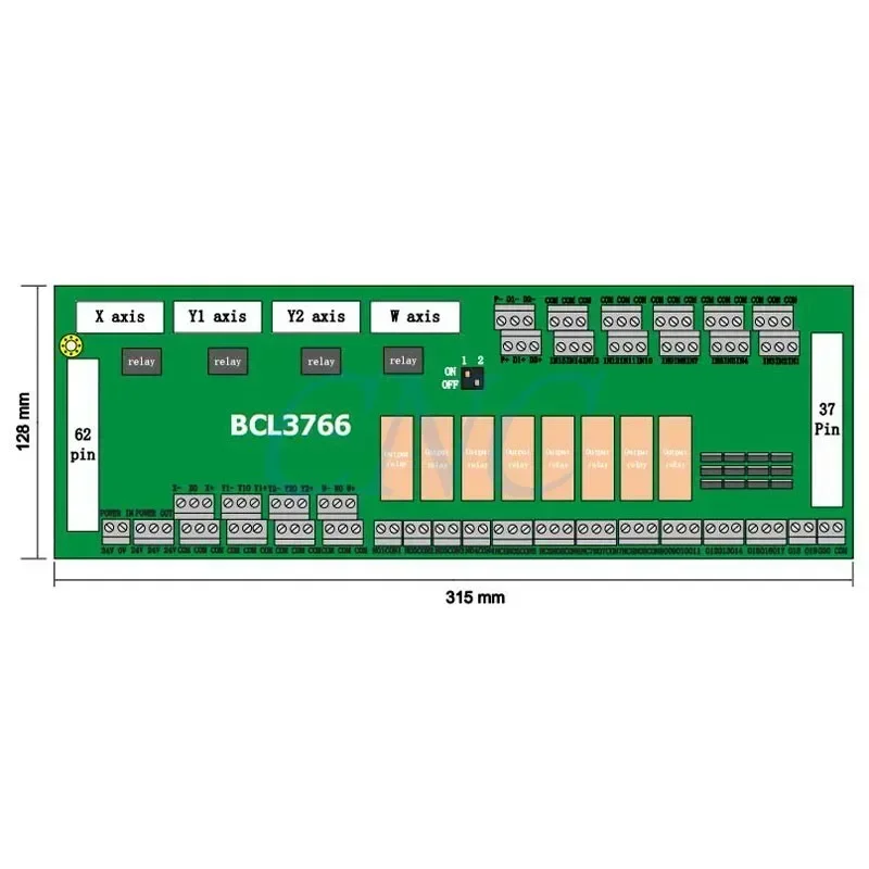The BCL3766 external I/O card is installed using a bus, or can be permanently installed. It has a DM62M and DB37M interface on two sides, which corresponds to JP1 and JP2 of the BMC1604V2 control board.