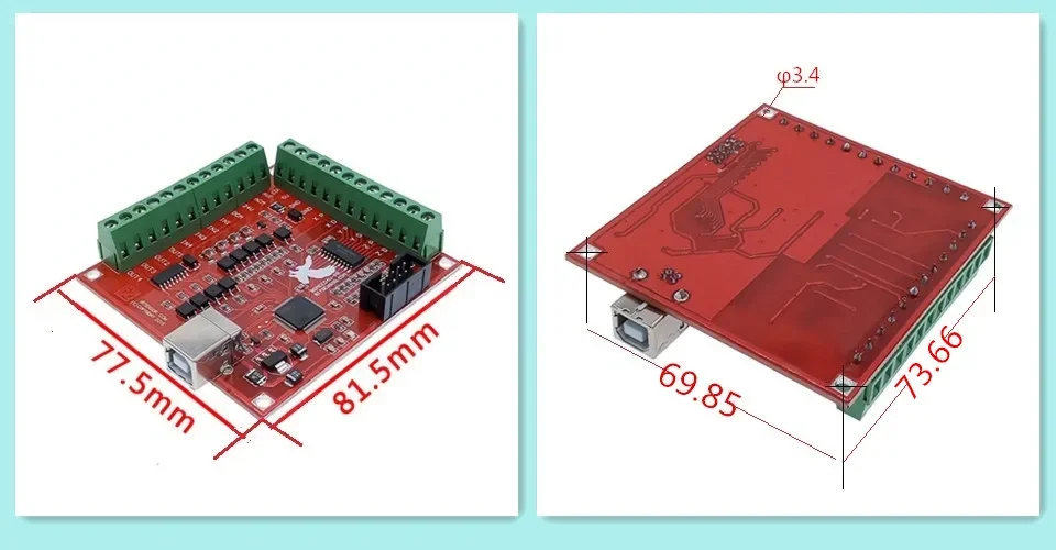 1.Features 1) Support for 4-axis linkage, you can connect four stepper motor drives or servo drives; 2) Maximum step-pulse frequency is 100 KHz, which is suitable for the servo or stepping motor; 3) Support automatic probe tool 4) Support Emergency input 5) Support for limit switch 6) Support for connecting electronic handwheel 7) Need use external 24V DC power supply to isolate USB and external port, and to make the system more stable. 8) Have 0-10V output port, you can use mach3 software to control the spindle motor speed. 9) 4 general-purpose inputs, you can connect the limit switch, estop switch, probe switch, back to zero and other device 10)4 general-purpose isolated relay drive output interface, can drive four relays for controlling the spindle starts, forward rotating and reverse rotating, pumps and other device; 11)1 status LED, indicate connection status on the board.
