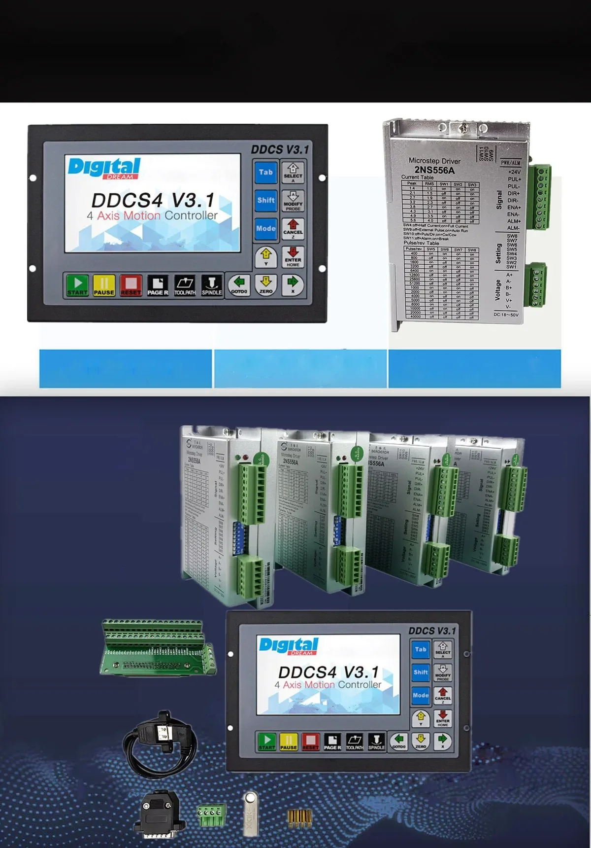 CNC Router 3/4-axis Kit Controller DDCSV3.1 + Stepper Motors Drives 2NS556A For Around 3NM NEMA23/34 motor