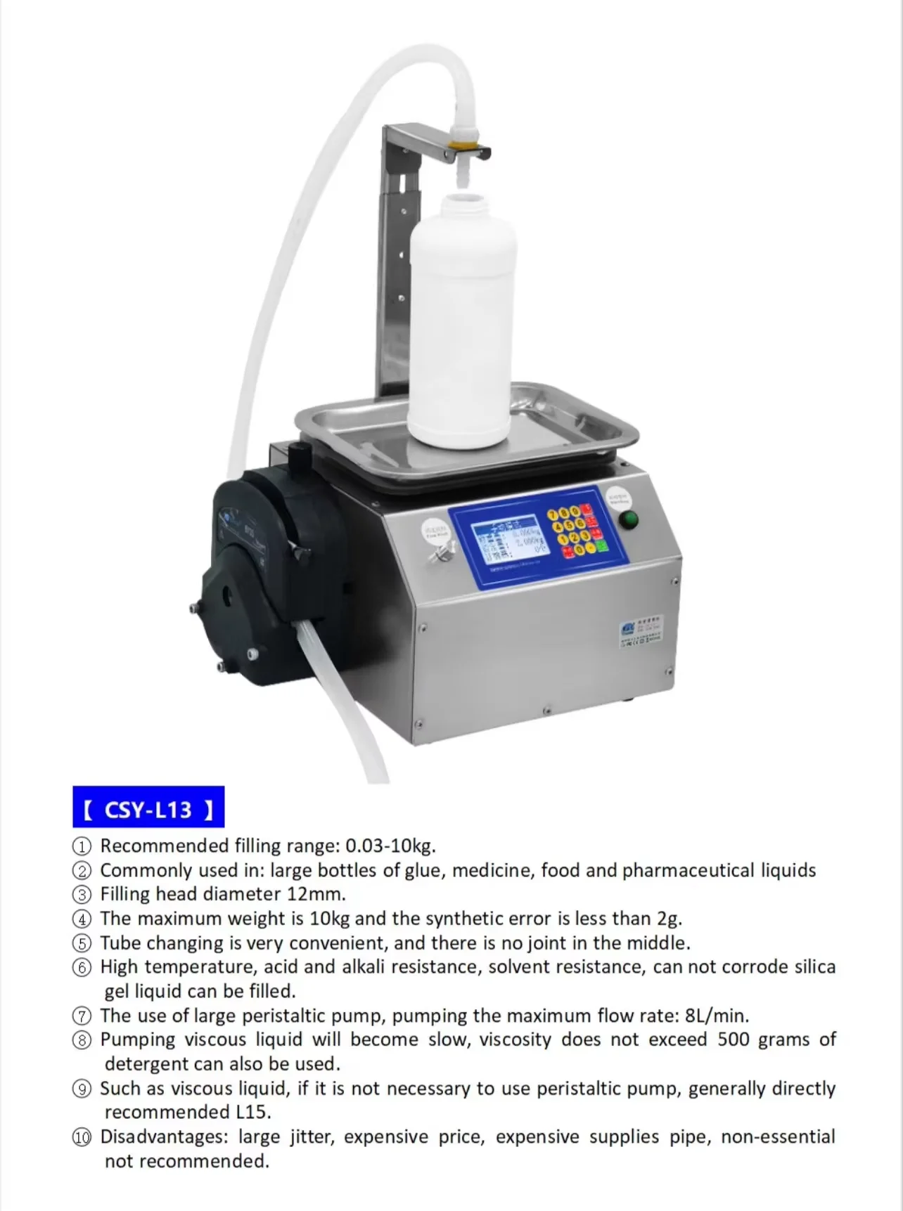2. Use: vegetable oil, glass water, detergent, shampoo, yogurt, white wine, soy sauce vinegar, bee, wood glue and other drinks 3. The maximum weight of this machine is 15KG 4. Flow rate :12L/ min 5.220 V / 150 w 6. Error :≤2g |