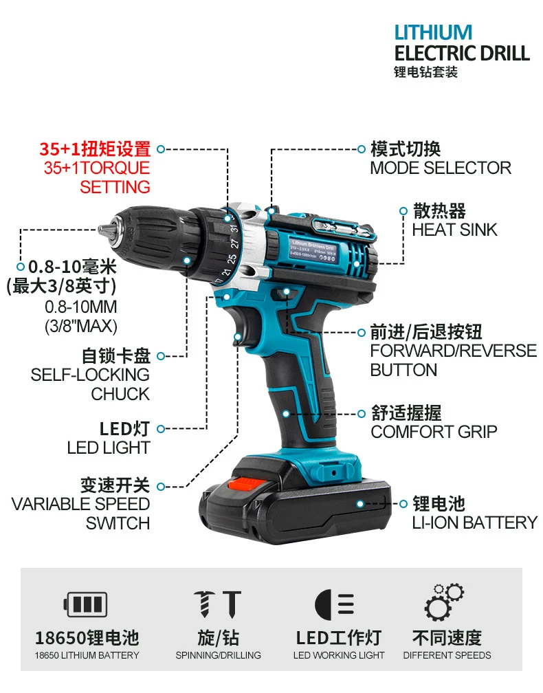 TEBAK Two-Speed Cordless Electric Power Tools 21V three function Impact drill Brush battery Impact Drill electric screwdriver
